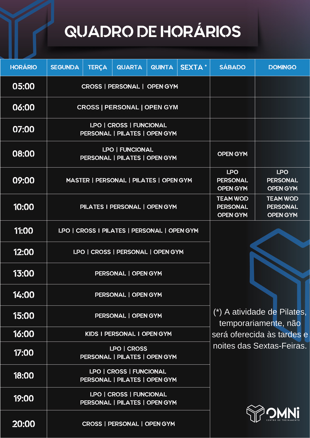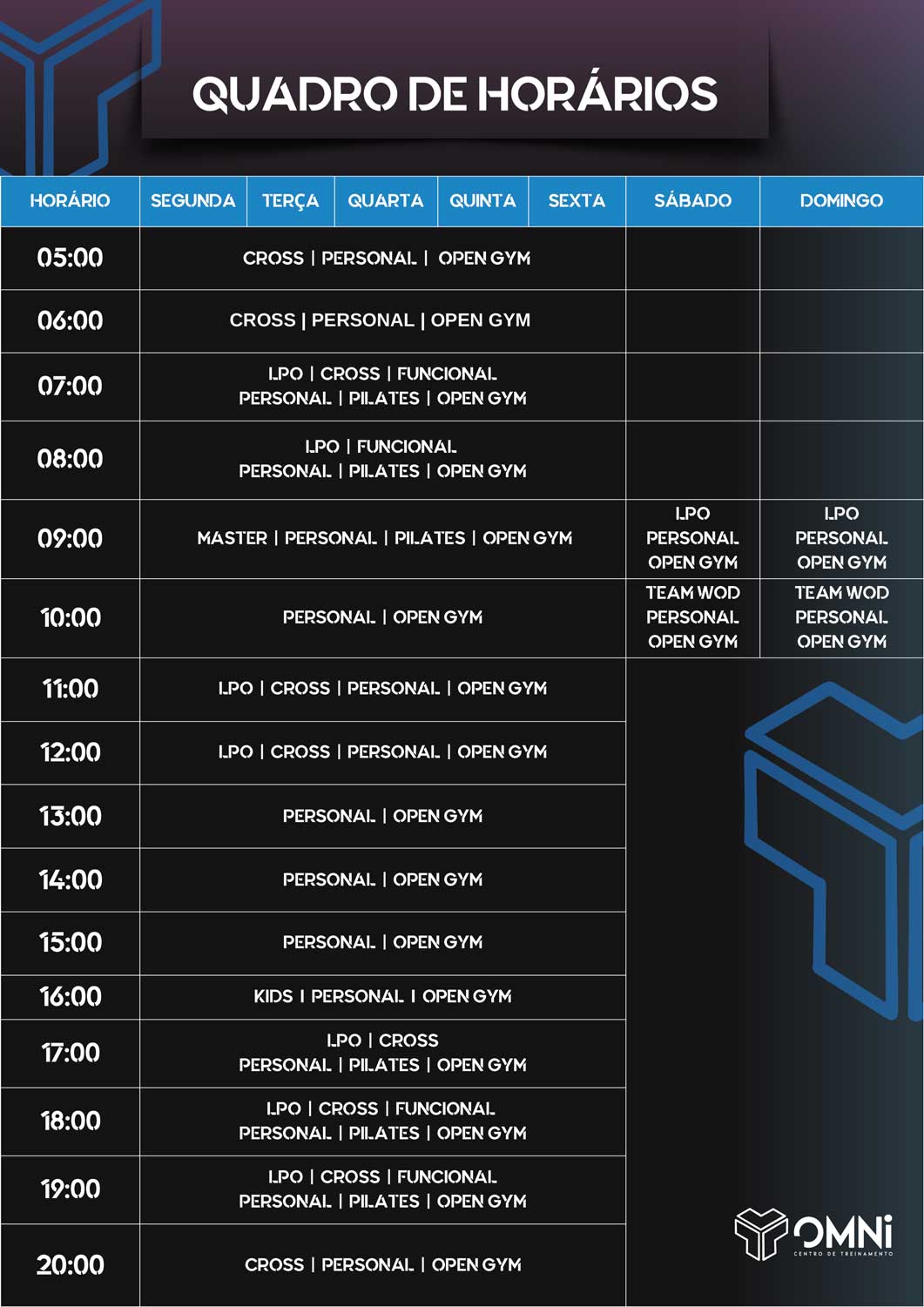 | OPEN GYM | Espaço livre para você treinar como quiser. Ideal para complementar sua rotina ou realizar treinos independentes. |
